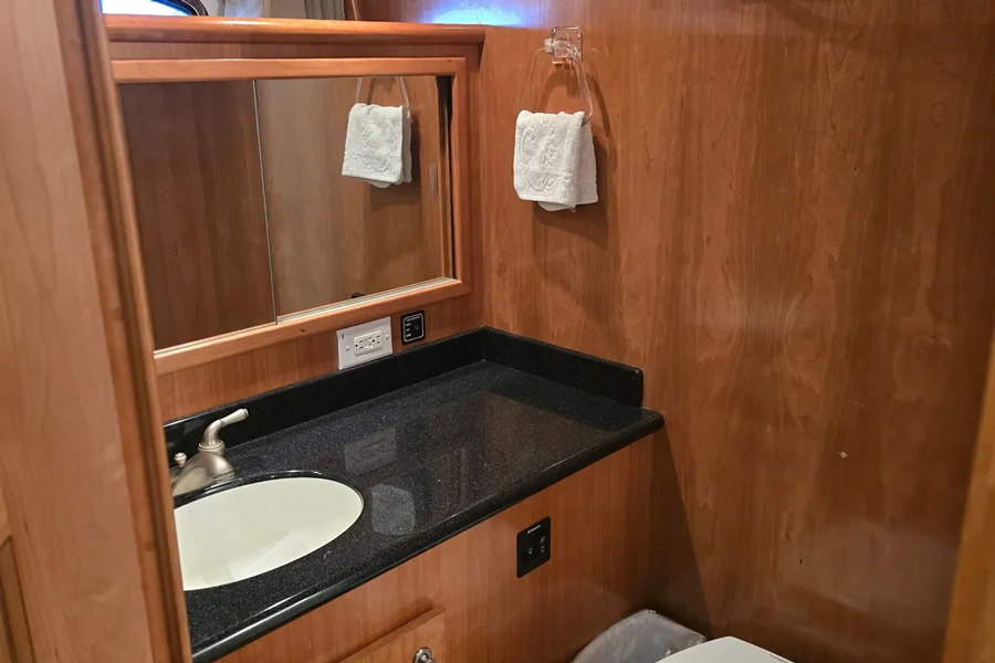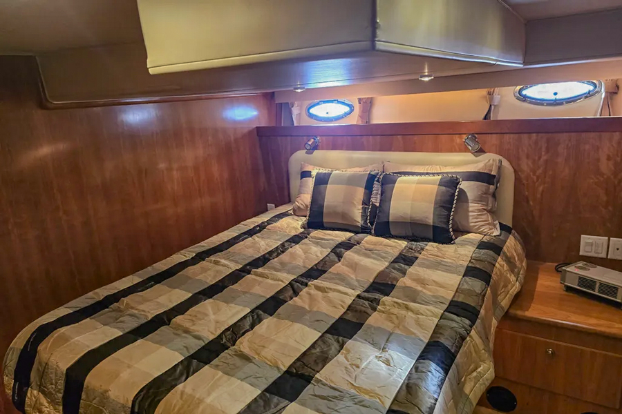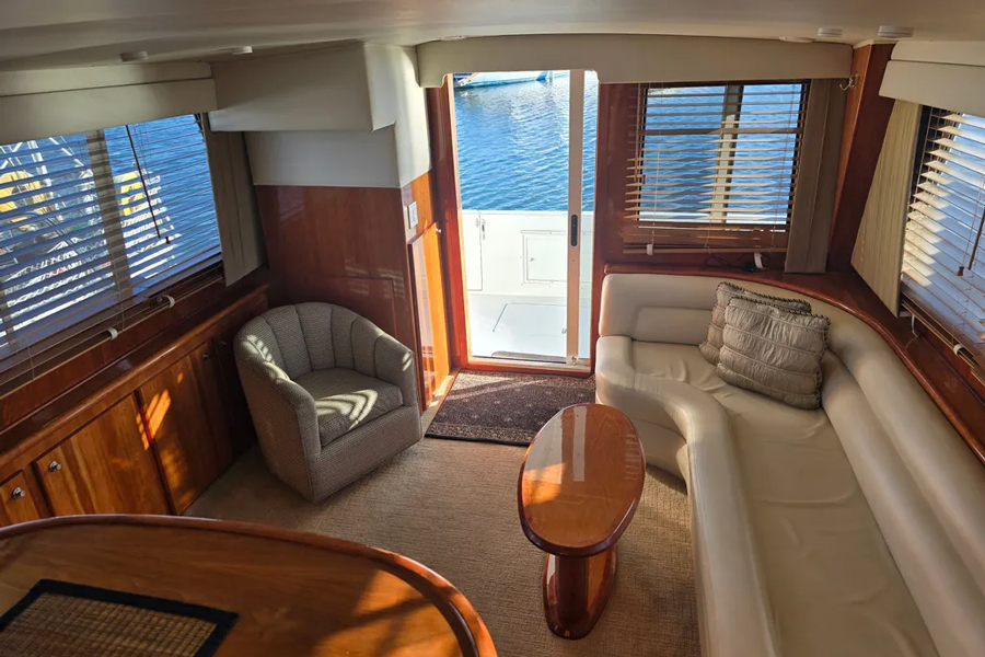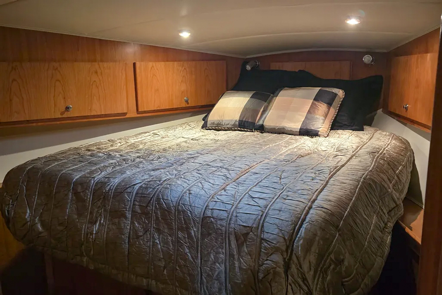 The raised pilothouse combines a bright galley and dinette with excellent visibility, while the salon below provides a warm, inviting space with elegant cherry finishes and generous seating. Twin diesel engines deliver a smooth, efficient ride, cruising comfortably in the mid-teen knot range. Wide side decks and a bow thruster ensure easy, confident handling.