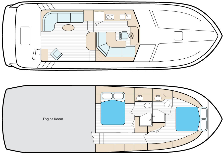 - Spacious 2-stateroom / 2-head layout – both with queen berths and private ensuites
