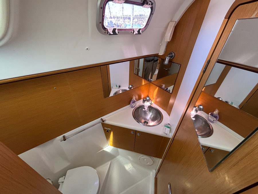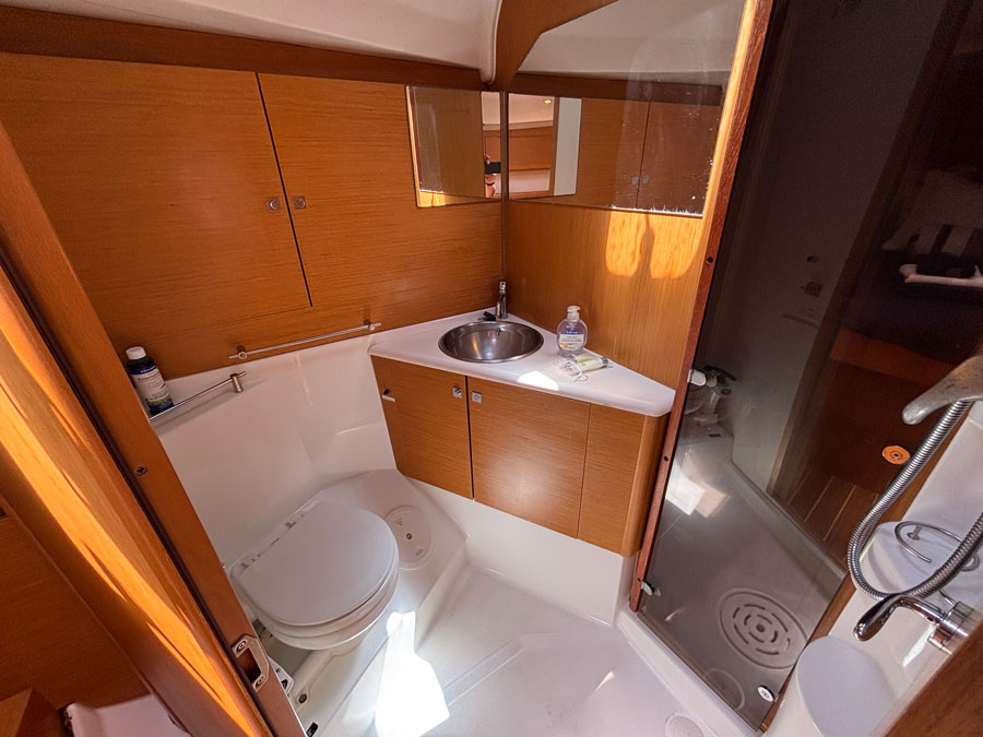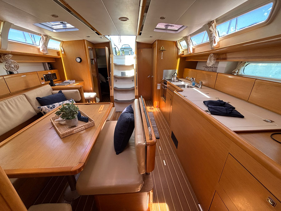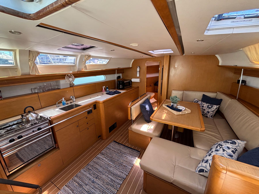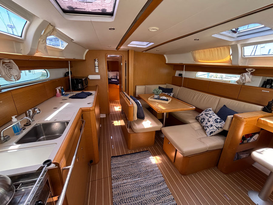 Below deck, you’ll find three spacious staterooms, each with a private, en suite head (bathroom) for privacy and comfort. The yacht’s open and airy salon features generous seating, large windows for natural light and panoramic views, and a fully equipped galley—perfect for preparing meals while at anchor or underway.