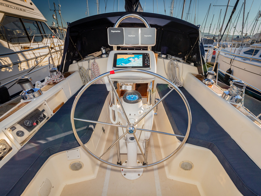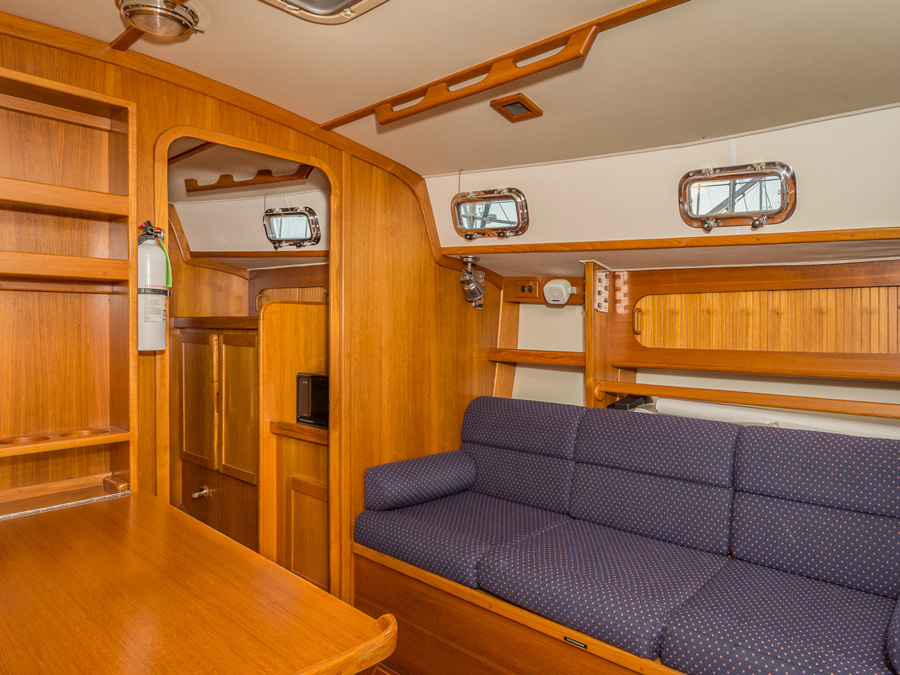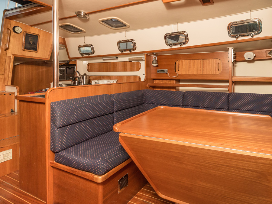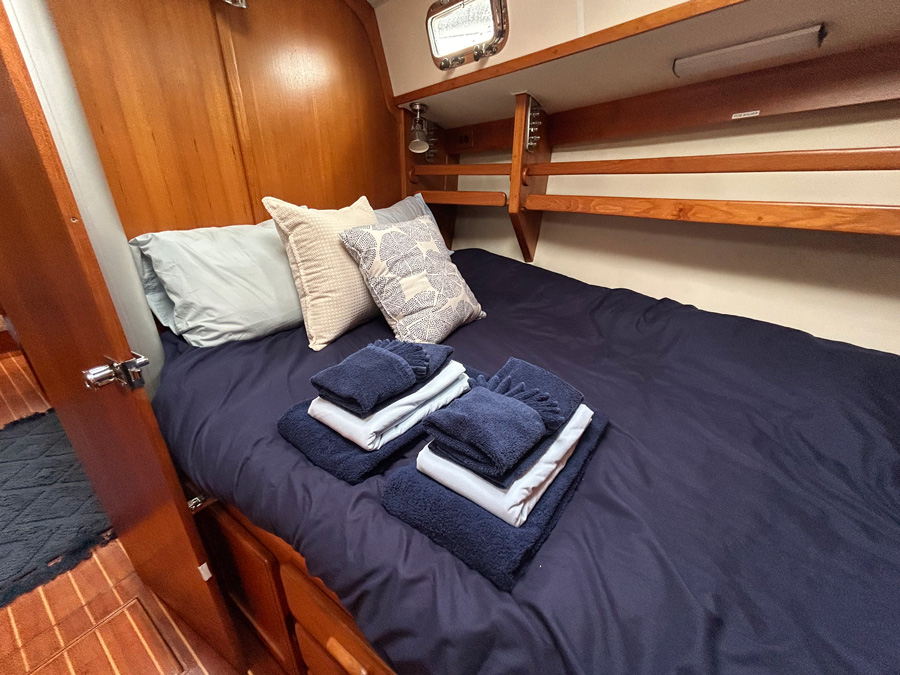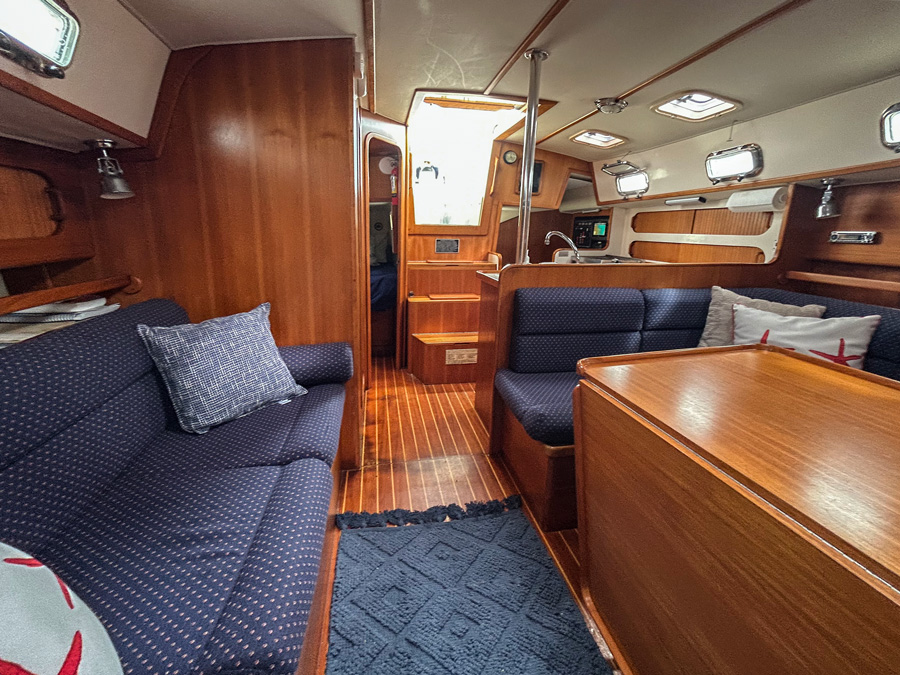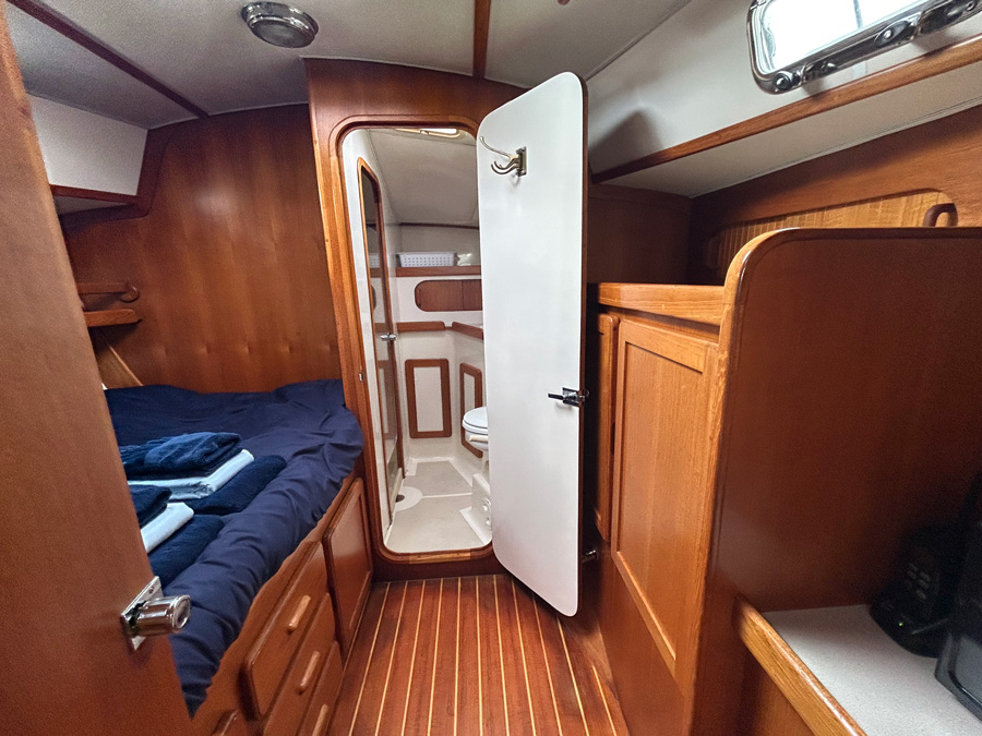 Onboard, comfort meets functionality. The spacious salon features a large table that comfortably seats six, ideal for meals or socializing. A generous hanging locker in the forward stateroom offers ample storage, while the large, separate shower enclosure provides a refreshing space after a day on the water.